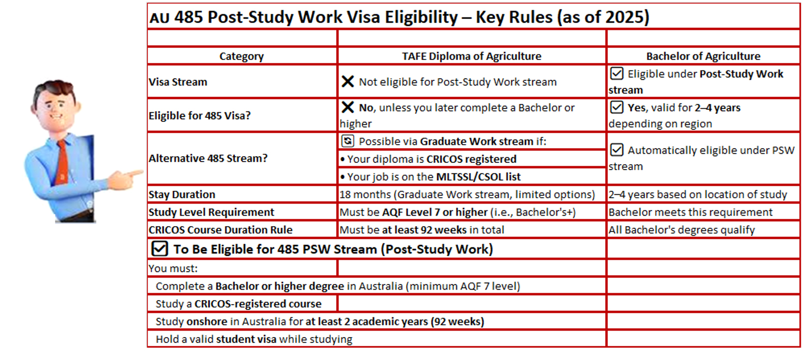 AQF 6 Advanced Diploma / Associate Degree Advanced Diploma (less common in India) or part-Bachelor equivalent β†’ Bachelor Degree (AQF 7) β†’ Bachelor’s Degree (regular) πŸŽ“ Graduate Visa (Subclass 485 – Temporary Graduate, Vocational Education & Training (VET) Stream) βœ… Key Requirements:
