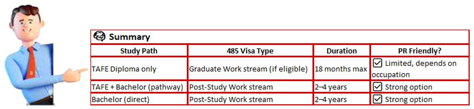 οƒ˜ If eligible, the Temporary Graduate Visa (485) – VET stream grants 18 months stay in Australia (sometimes longer if concessions apply).