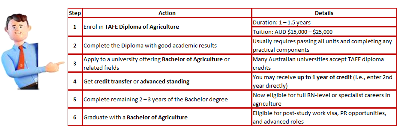 AQF 7 Bachelor Degree (BA, BSc, BCom, BEng, etc.) Indian Bachelor (BA, BSc, BCom, BTech, etc.) β†’ Graduate Certificate / Graduate Diploma (AQF 8) or Master (AQF 9) β†’ Master’s Degree (MA, MSc, MBA, MTech) πŸ“Œ About the VET Stream Duration